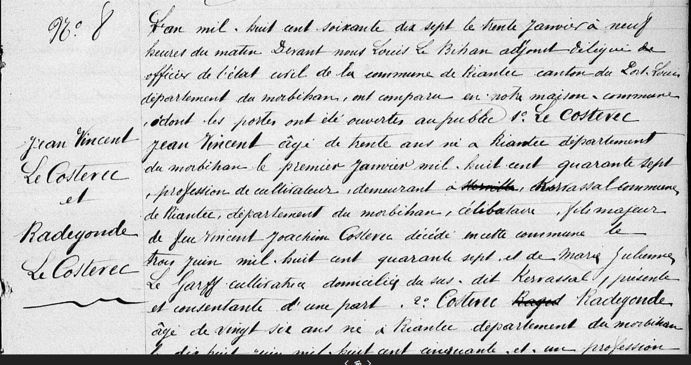 | 3. COSTEVEC (LE) Jean Vincent Naissance : Date : 01/01/1847 Lieu : Riantec (56), Kervassal Union : Date : 30/01/1877 Lieu : Riantec (56) avec COSTEVEC (LE) Radegonde. |
