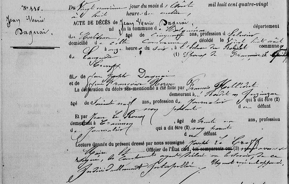 | Il voit le jour à Languidic (56) 13/07/1869. Signature : Y. Père : DACQUAI Jean Marie, Eclusier Naissance : Date : ../../1830 Lieu : Malguénac (56) Décès : Date : 28/08/1880 Lieu : Languidic (56), Ecluse du Roidet à l'âge de 50 ans. Mère : CUNFF (LE) Marie Françoise, Ménagère Naissance : Date : ../../1831 Lieu : Cléguérec (56) Décès : Date : 14/02/1881 Lieu : Languidic (56), Lanveur à l'âge de 50 ans. A sa naissance, ses père et mère étaient âgés de 39 ans et 38 ans. |