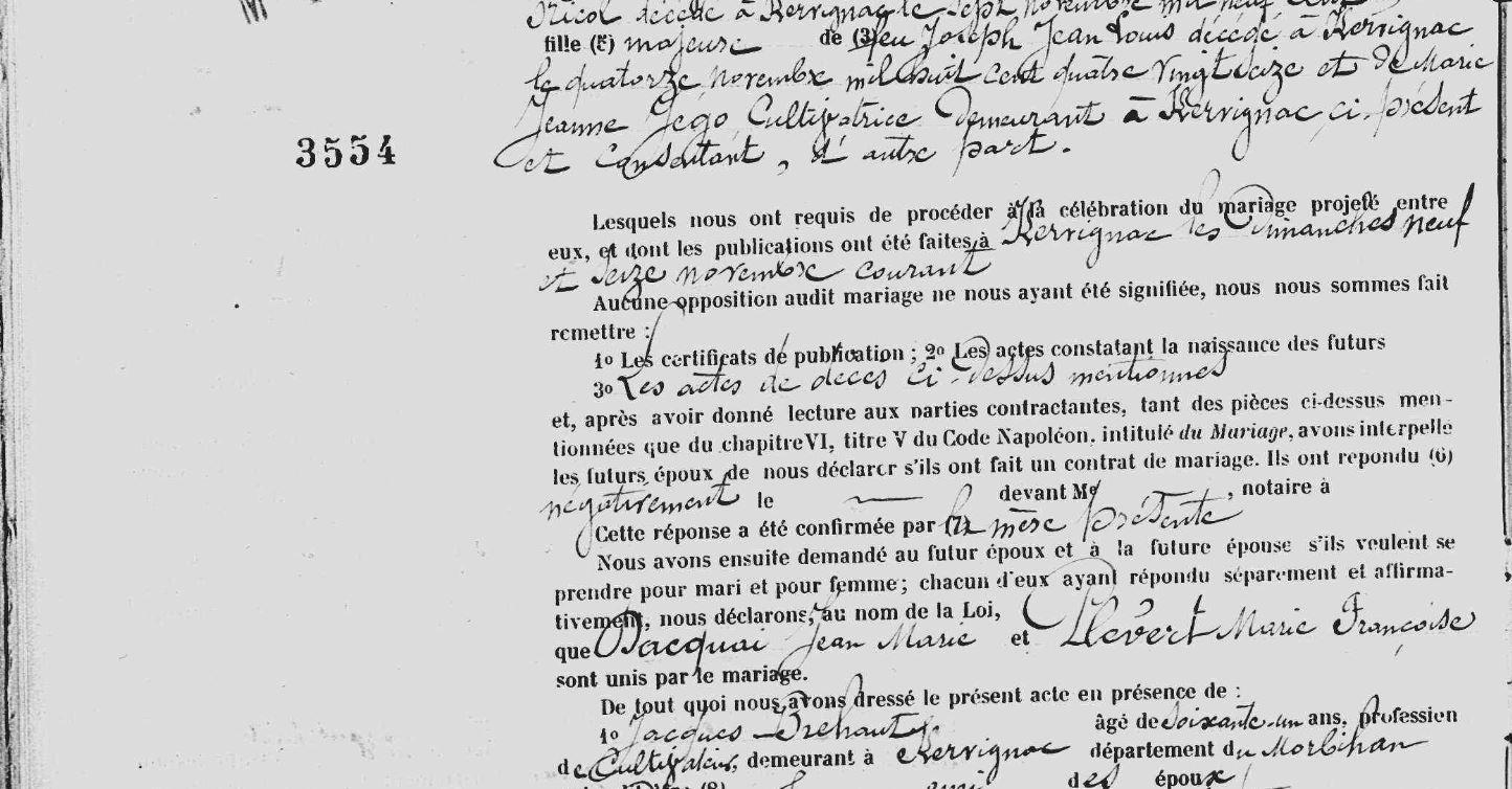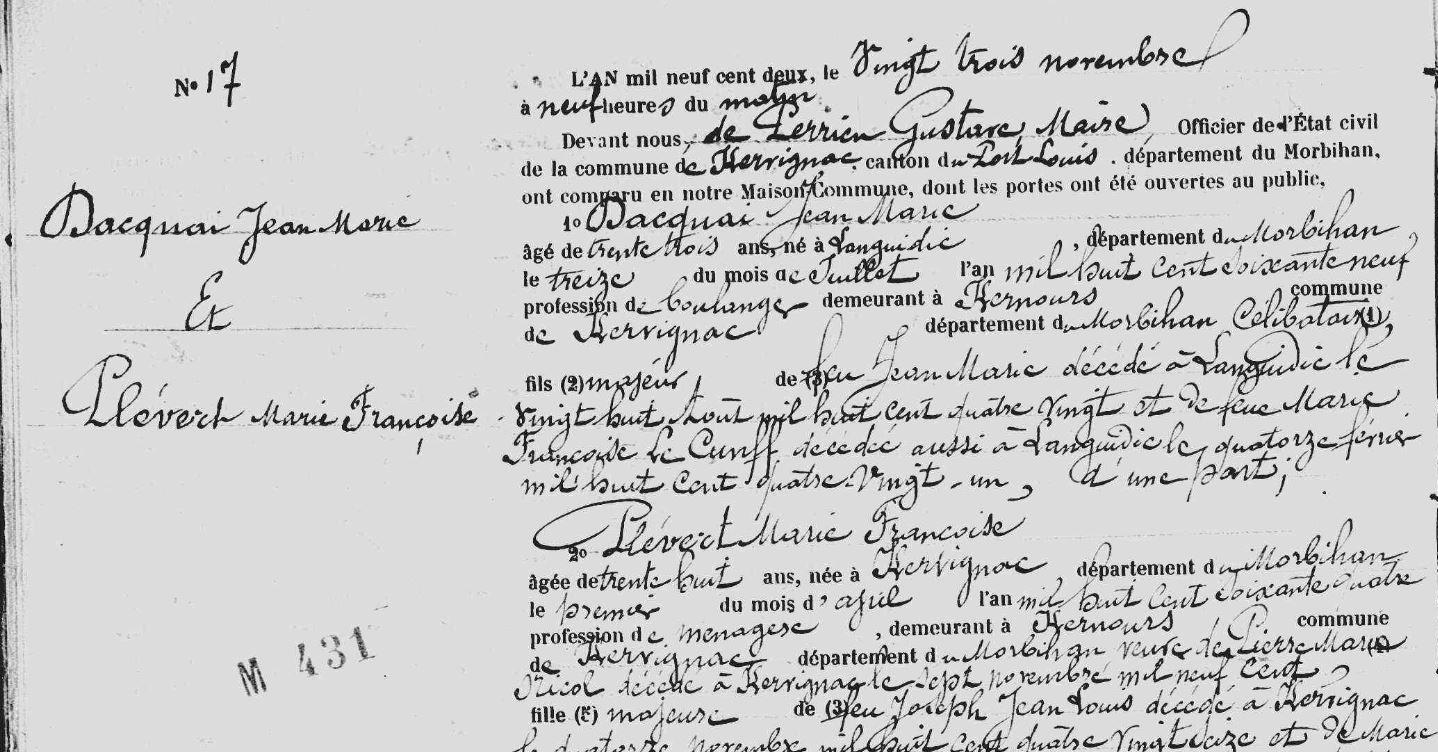 | 1. DACQUAI Jean Marie Naissance : Date : 13/07/1869 Lieu : Languidic (56) Union : Date : 23/11/1902 Lieu : Kervignac (56) avec PLEVERT Marie Françoise. |