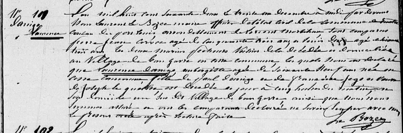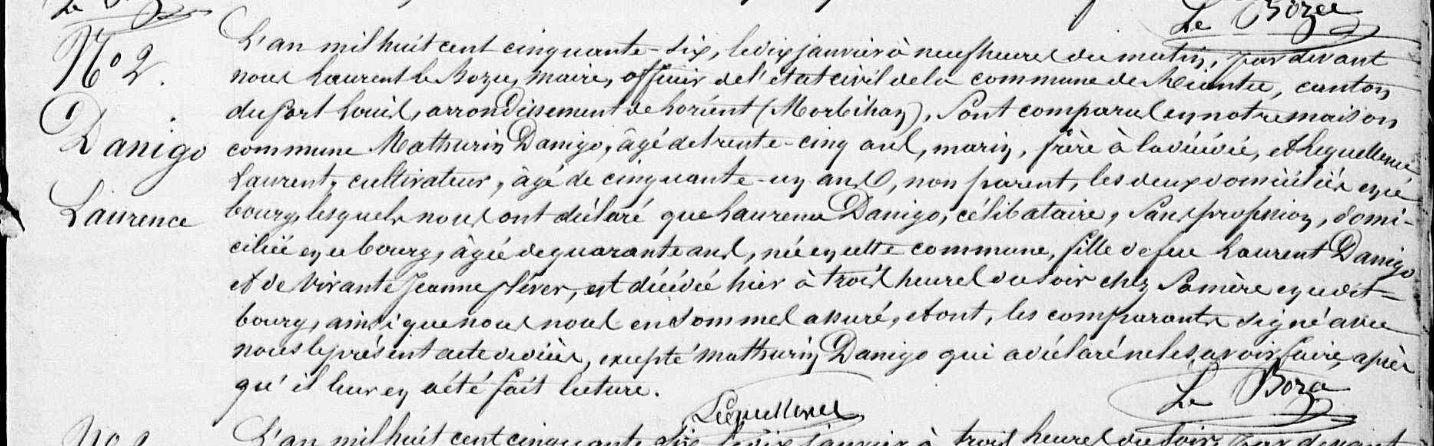 | 2. DANIGO Laurence Naissance : Date : 02/01/1816 Lieu : Riantec (56), Bourg Décès : 1 Date : 09/01/1856 Lieu : Riantec (56), Bourg à l'âge de 40 ans. |