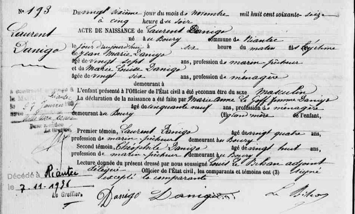| Naissance DANIGO Laurent - 1876 - Riantec |