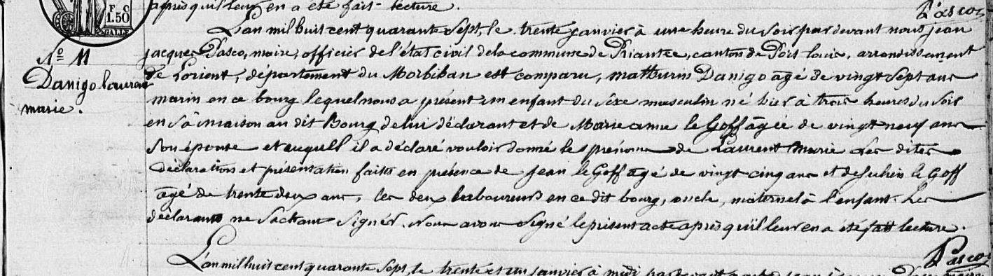 | Naissance DANIGO Laurent Marie - 1847 - Riantec |