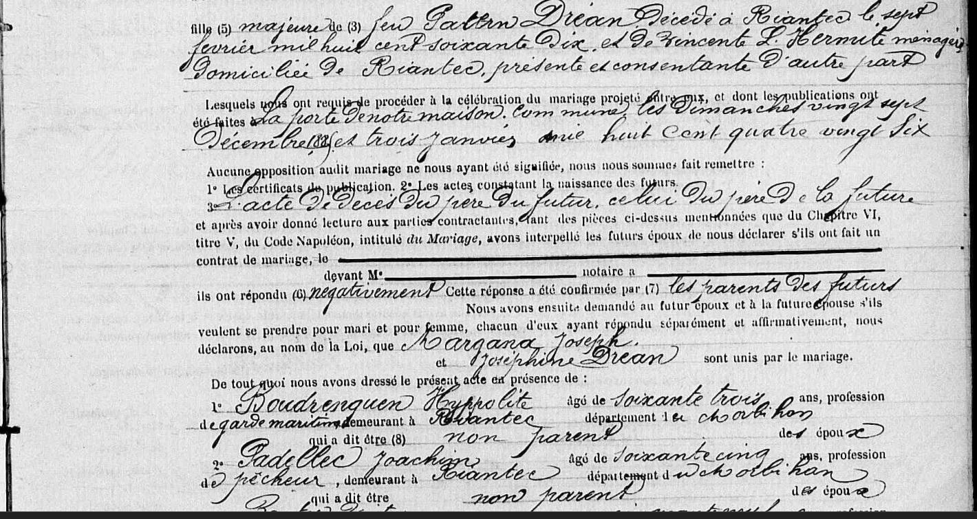 Mariage MARGANA Joseph DREAN Josephine - 1886 - Riantec - 2 |
