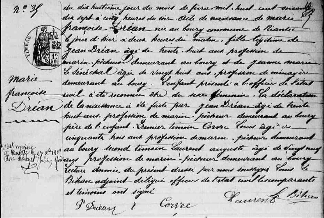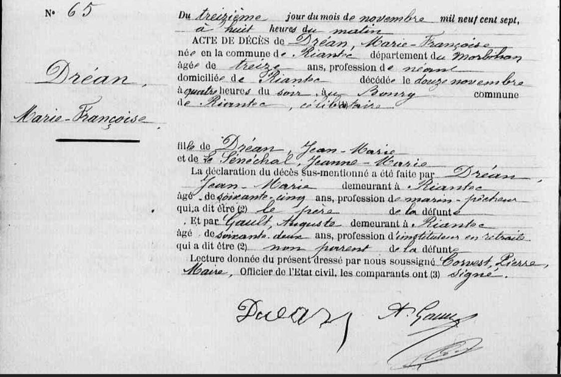 | Elle voit le jour 17/02/1877 à Riantec (56), Bourg. Père : DREAN Jean Marie, Marin pêcheur Naissance : Date : 15/02/1843 Lieu : Riantec (56), Kerderff Décès : Date : ../../1923 Lieu : Riantec (56) à environ 79 ans. Mère : SENECHAL (LE) Jeanne Marie, Ménagère Naissance : Date : 22/06/1850 A sa naissance, ses père et mère étaient âgés de 34 ans et 26 ans. |