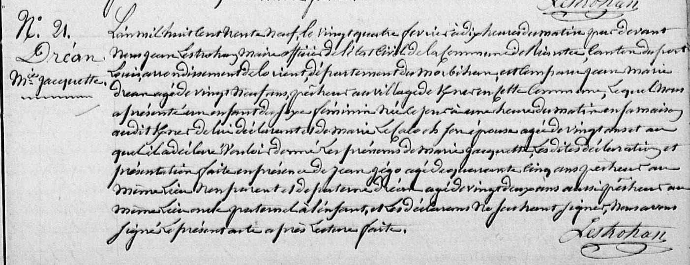 | Naissance DREAN Marie Jacquette - 1839 - Riantec |
