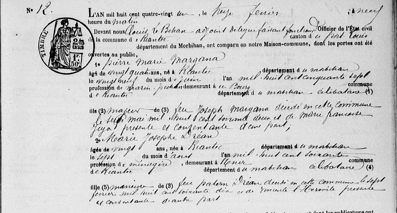 Mariage MARGANA Pierre Marie DREAN Marie Josephe - 1881 - Riantec - 1 |