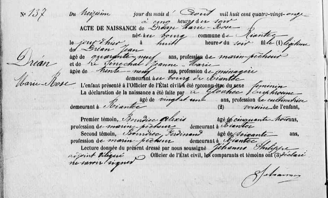 | Naissance DREAN Marie Rose - 1891 - Riantec |