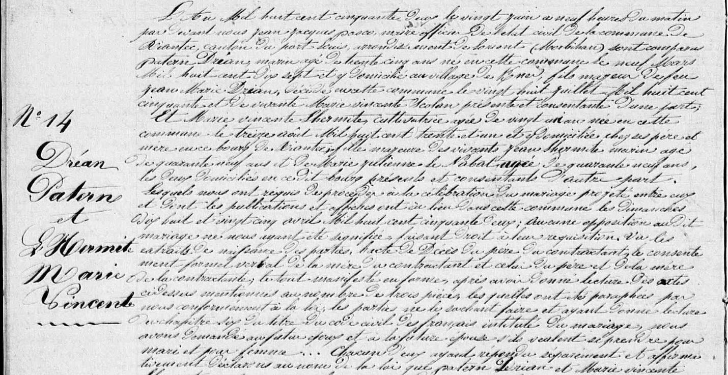 Mariage DREAN Patern L'HERMITE Marie Vincente - 1852 - Riantec - 2 |