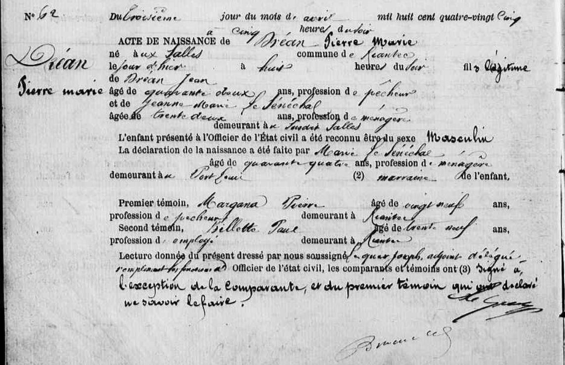 | Naissance DREAN Pierre Marie - 1885 - Riantec |
