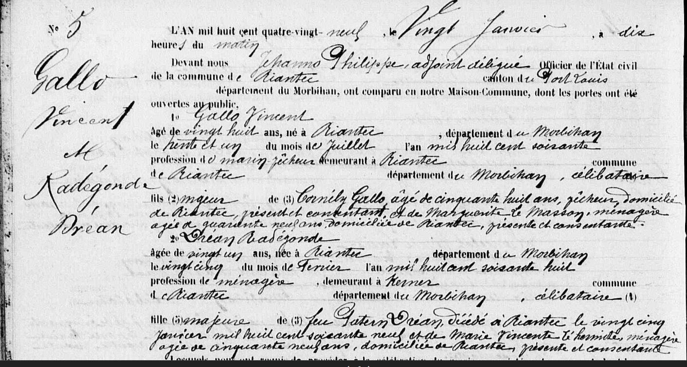 Mariage GALLO Vincent DREAN Radegonde - 1889 - Riantec - 1 |
