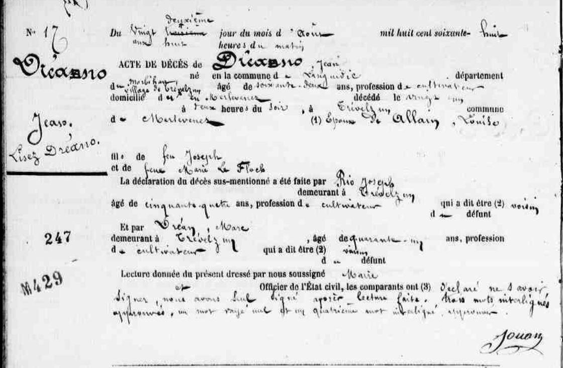 | Décès DREANO Jean - 1868 - Merlevenez |