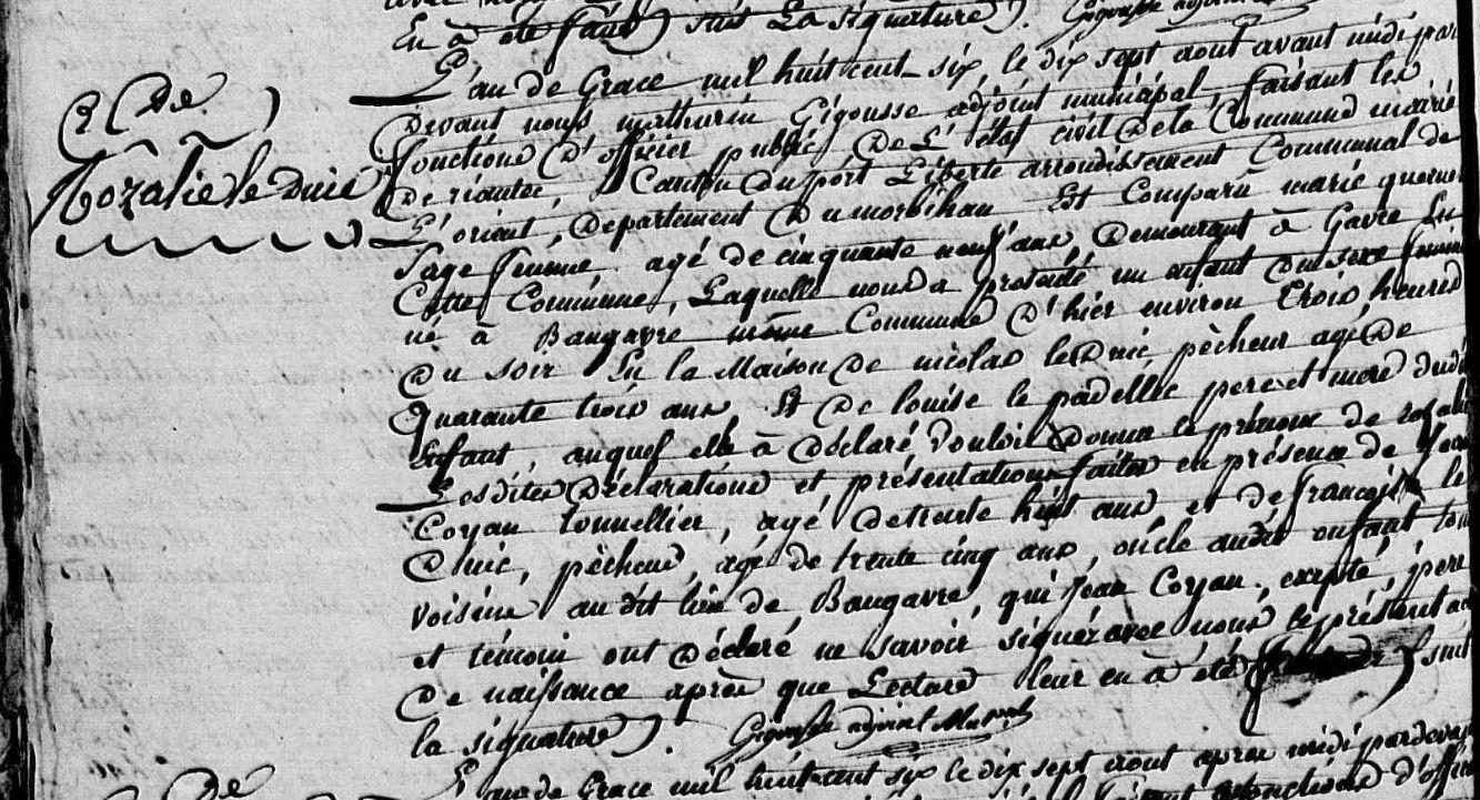 | Il voit le jour à Riantec (56), Gâvres 20/07/1791. Il est baptisé 21/07/1791 à Riantec (56), Eglise paroissiale de Riantec à l'âge de 1 jour. Signature : Non. Père : DUIC (LE) Jean François, Marin pêcheur Naissance : Date : 23/11/1744 Lieu : Riantec (56) Décès : Date : 26/12/1820 Lieu : Riantec (56) à l'âge de 76 ans. Mère : LESCOËT Anne Naissance : Date : 17/04/1748 Lieu : Riantec (56) Décès : Date : 03/04/1818 Lieu : Riantec (56) à l'âge de 69 ans. A sa naissance, ses père et mère étaient âgés de 46 ans et 43 ans. |