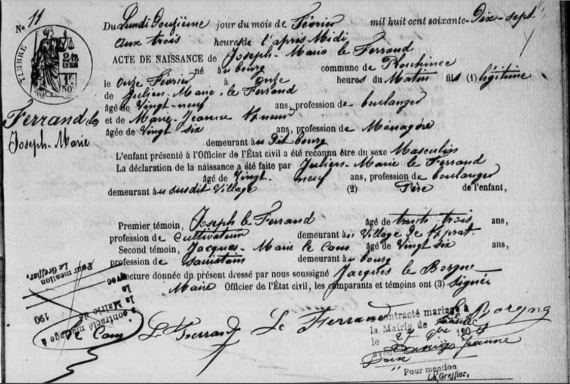 | Naissance FERRAND (LE) Joseph Marie - 1877 - Plouhinec |