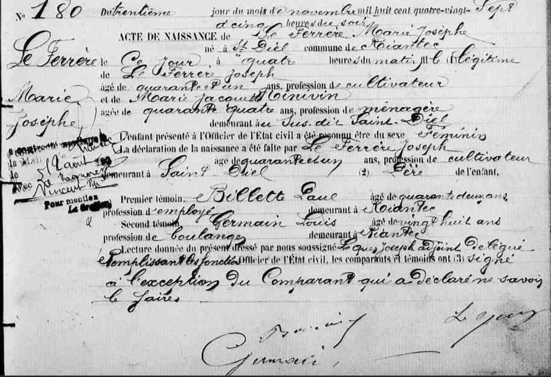 | 1. FERRERE (LE) Marie Josephe Naissance : Date : 30/11/1887 Lieu : Riantec (56), Saint Diel Union : Date : 12/08/1906 Lieu : Riantec (56) avec VAGUERESSE (LE) Vincent Marie. |