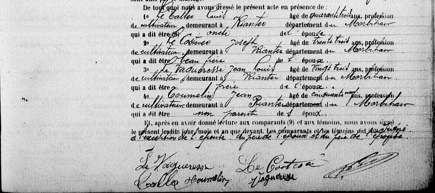 | Mariage : Date : 12/08/1906 Lieu : Riantec (56) VAGUERESSE (LE) Vincent Marie, Cultivateur Il naît à Riantec (56), Kervassal 08/11/1882. |