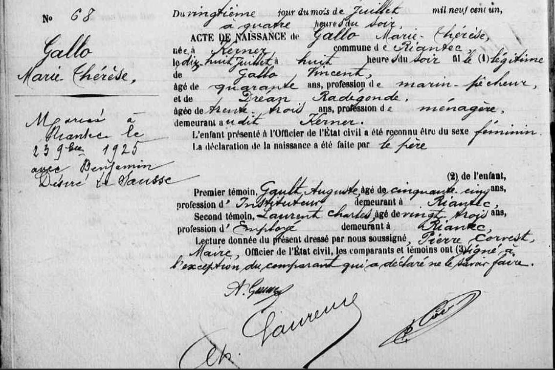 | Naissance GALLO Marie Thérèse - 1901 - Riantec |