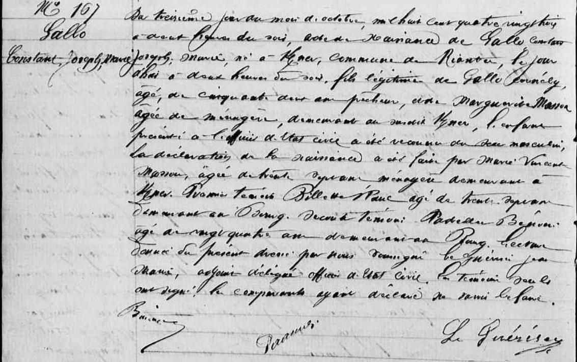 | Il est né ../../1785 . Signature : Non. Père : GALLO (LE) Jean René, Marin pêcheur Naissance : Date : ../../1753 Mère : A sa naissance, son père était âgé de 32 ans. |