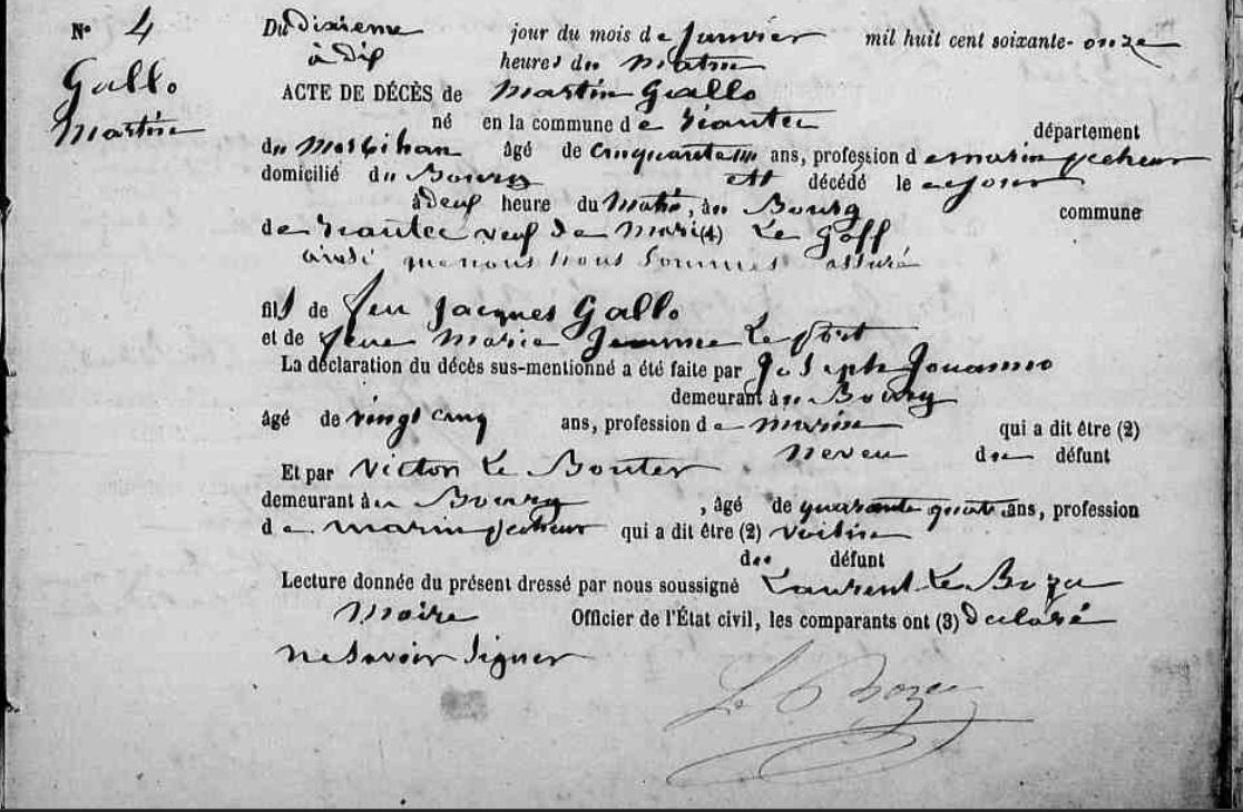 | 1. GALLO Martin Naissance : Date : 31/10/1844 Lieu : Riantec (56), Bourg Décès : 3 Date : 01/02/1912 Lieu : Riantec (56) à l'âge de 67 ans. |