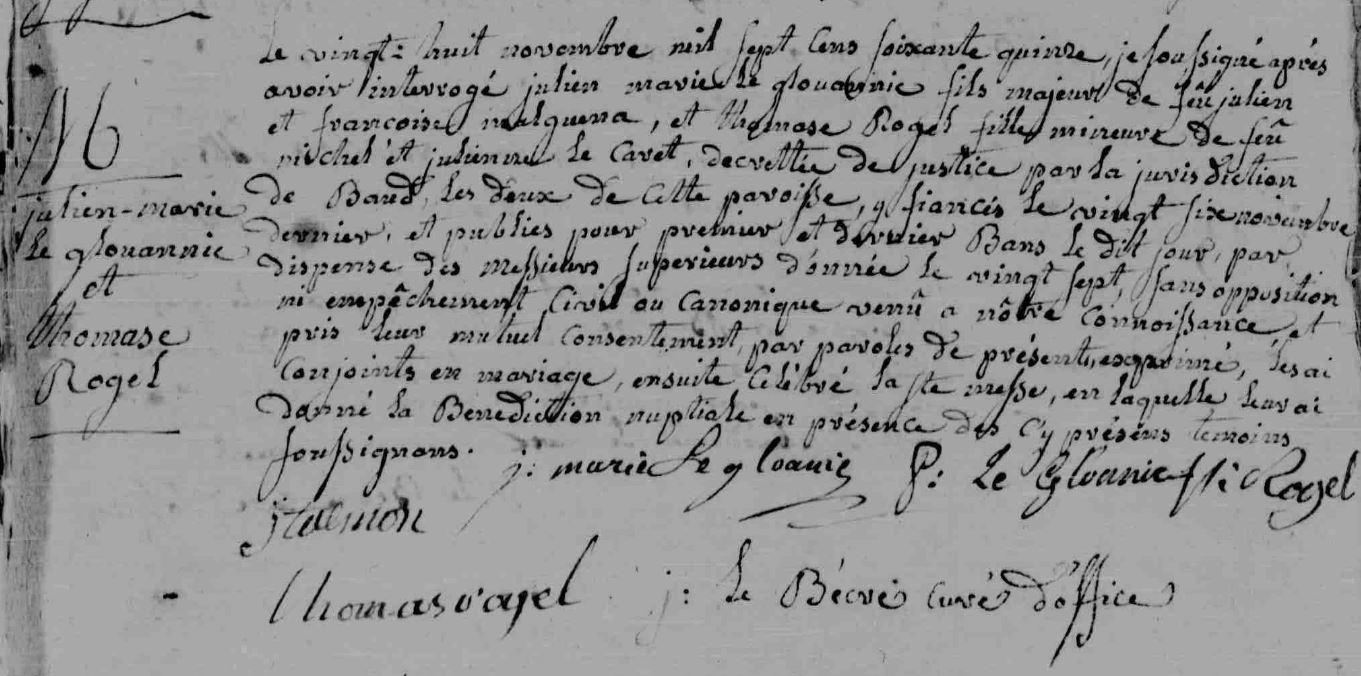 Mariage GLOANIC (LE) Julien Marie ROGEL Thomase - 1775 - Baud |