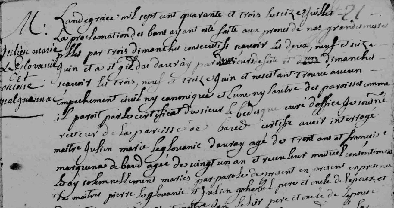 | Mariage GLOUANIC Julien Marie MALGUENAC Françoise - 1743 - Baud - 1 |