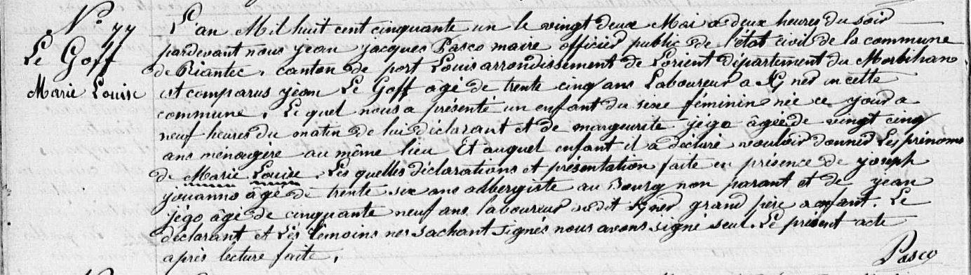 | Naissance GOFF (LE) Marie Louise - 1851 - Riantec |