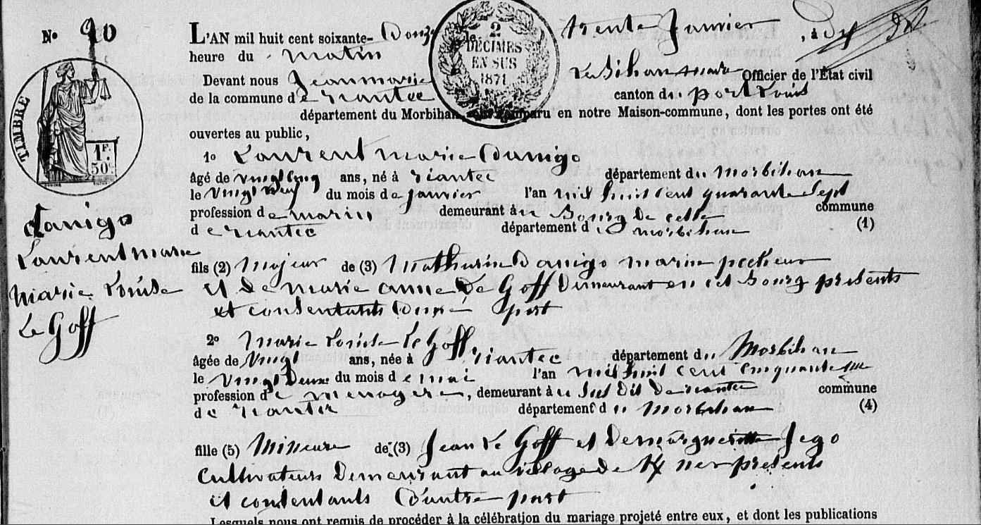 Mariage DANIGO Laurent Marie GOFF (LE) Marie Louise - 1872 - Riantec - 1 |