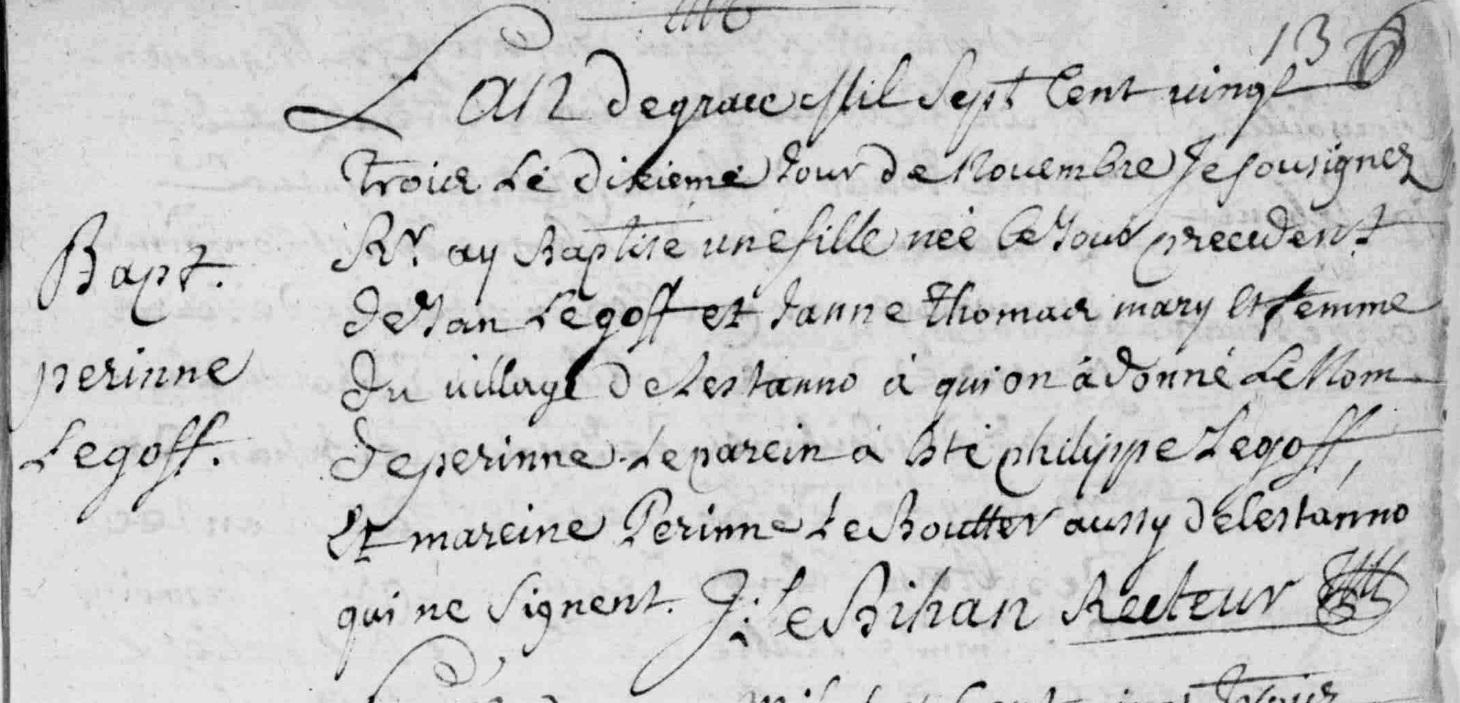| - GOFF (LE) Jan, Sosa 1312 (Naissance : 1660) - GARGEANT (LE) (GARJANT) Françoise, Sosa 1313 (Naissance : 1660 Décès : 1724) |