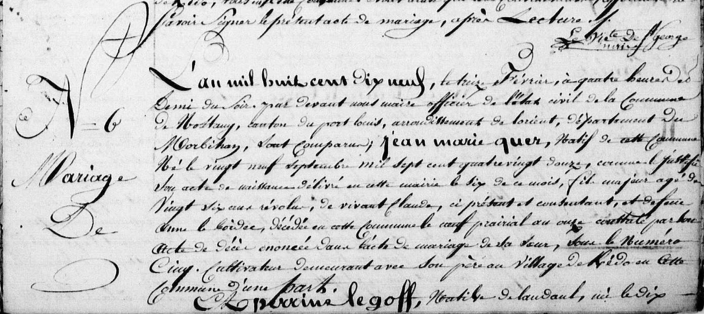 | Mariage de QUER Jean Marie GOFF (LE) Perrine - 1819 - Nostang - 1 |