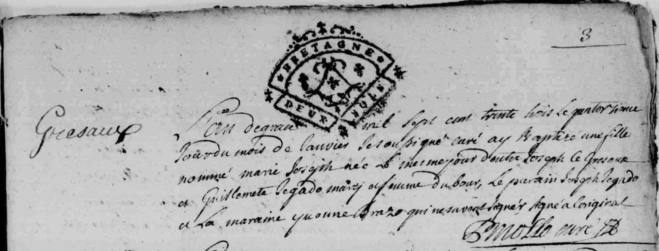 | 6. GRESAUX (LE) Joachim Naissance : Date : 07/01/1713 Lieu : Riantec (56) |