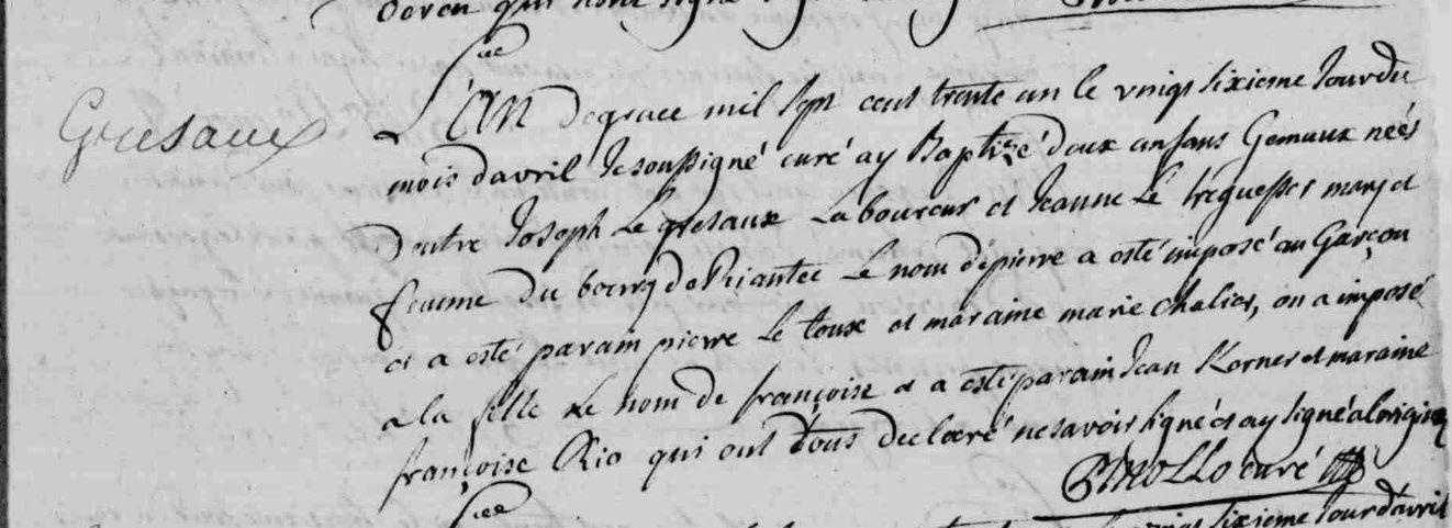 | Baptême GRESAUX (LE) Pierre - 1731 - Riantec |