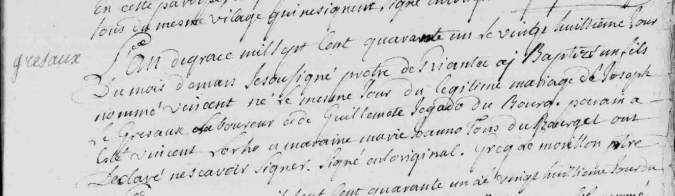 | 2. GRESAUX (LE) Joseph Naissance : Date : 30/03/1697 Lieu : Riantec (56) Union : Date : 11/02/1722 Lieu : Riantec (56) avec TREQUESSER (LE) Jeanne. Union : Date : 11/02/1732 Lieu : Riantec (56) avec JEGADO Guillemette. |