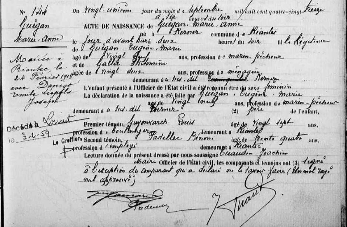 | Naissance GUEGAN Marie Anne - 1893 - Riantec |