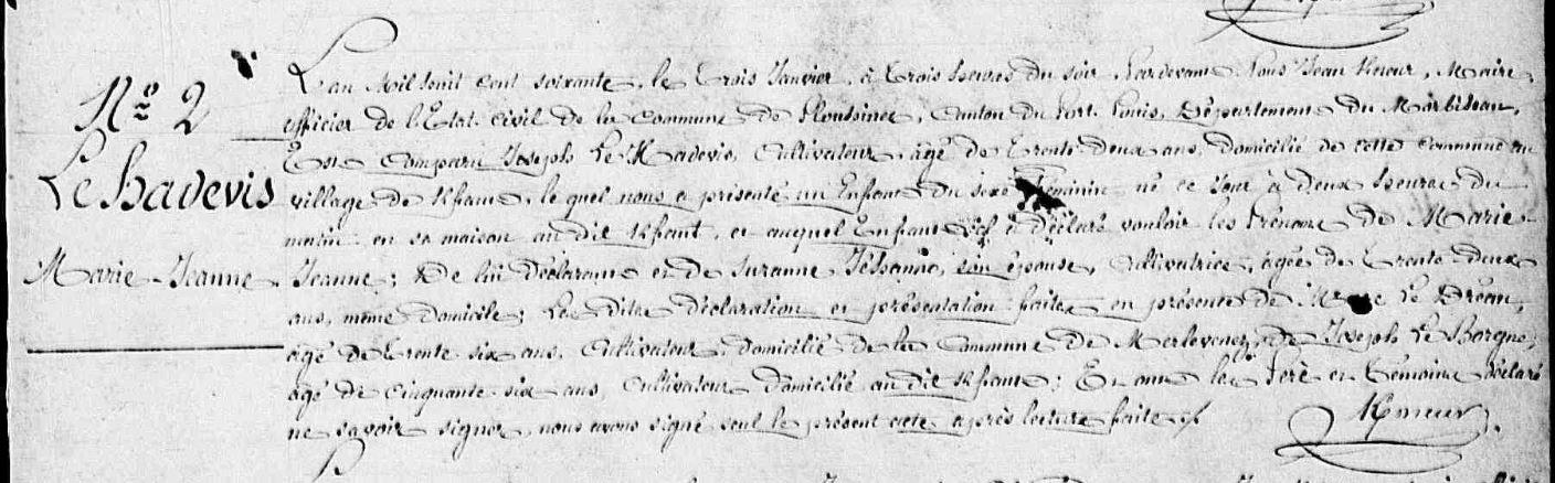 | Enfant(s) de HADEVIS (LE) OU ADEVIZE Julien et de DANIGO Hélène : - HADEVIS (LE) Louis (Naissance : 1794) - HADEVIS (LE) Françoise (Naissance : 1796) Union 1821 : NEZET (LE) Jean - HADEVIS (LE) OU ADEVIZE Marc (Naissance : 1800) |