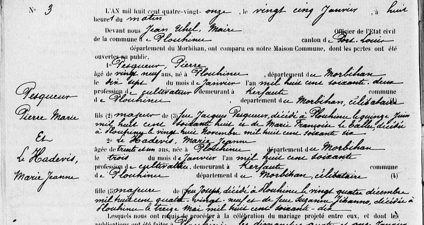 Mariage PESQUEUR Pierre Marie HADEVIS (LE) Marie Jeanne - 1891 - Plouhinec - 3 |