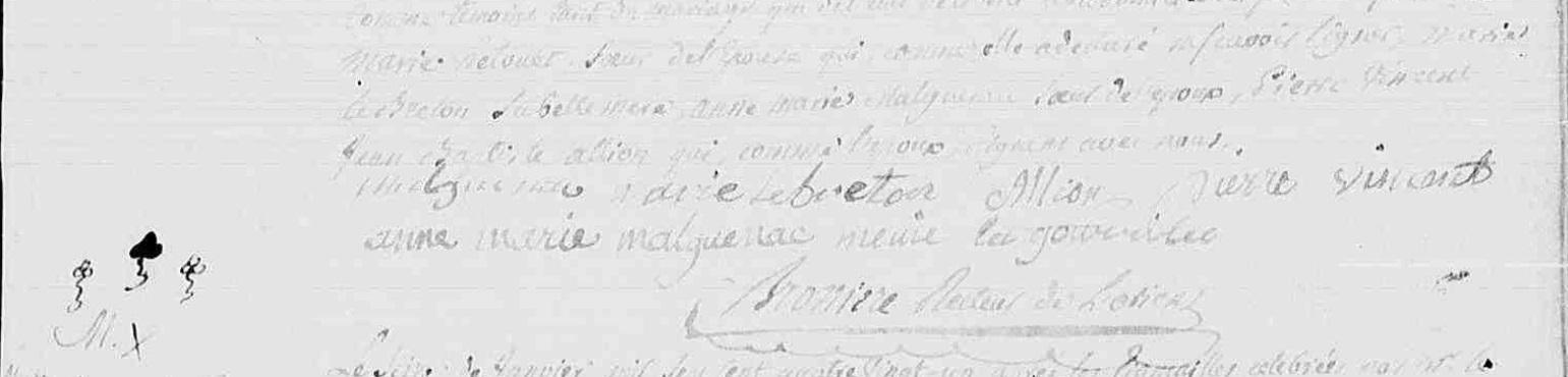 | Il est né ca ../../1758 . + 27/10/1818 Baud (56), - - - NO à environ 60 ans. Signature : Y. |
