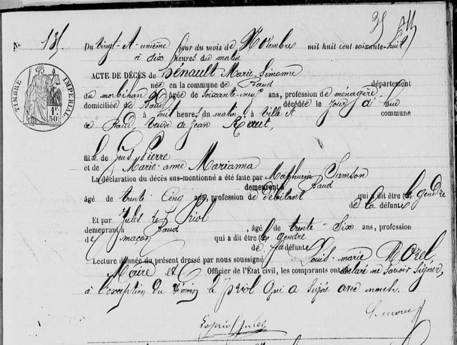 | Décès HINAULT Marie Simone - 1868 - Baud |