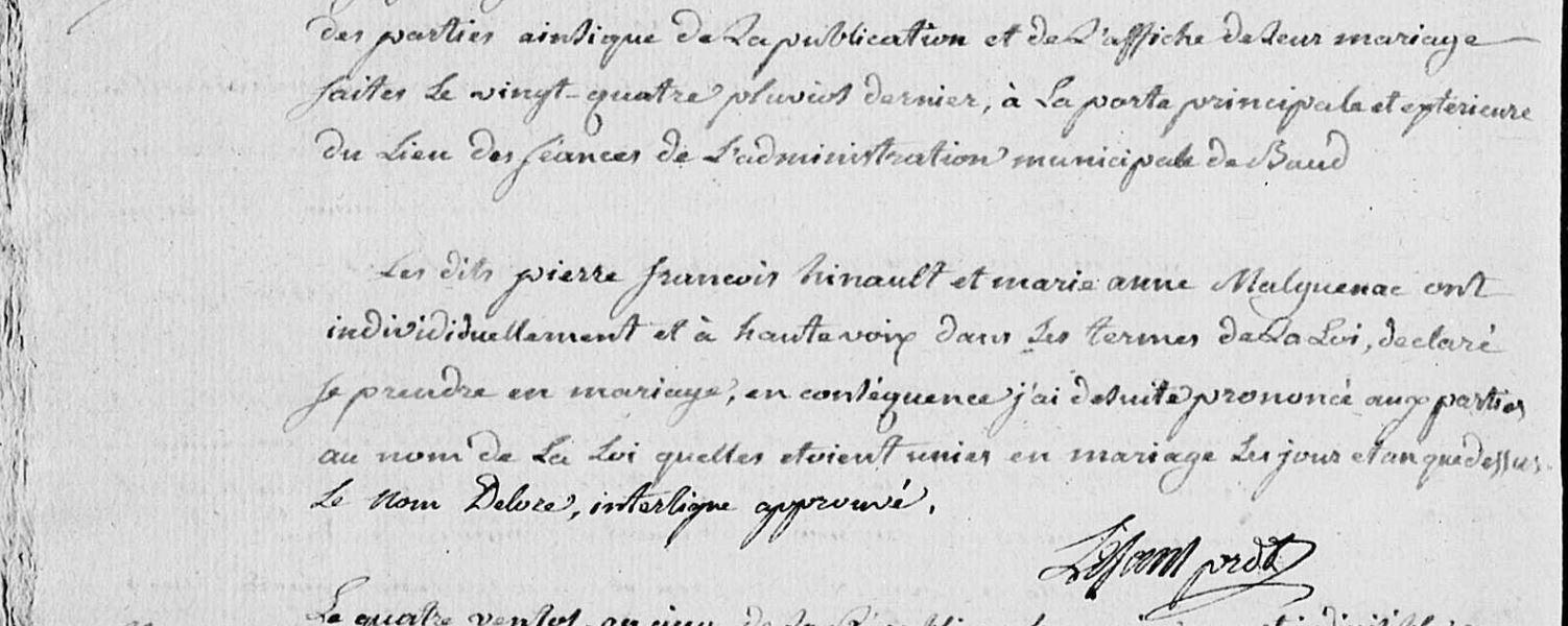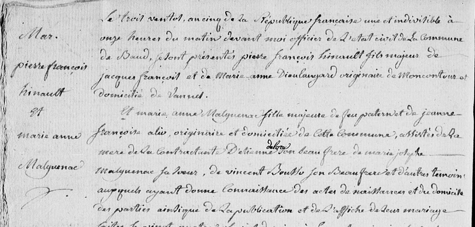 Mariage HINAULT Pierre François MALGUENAC Marie Anne - 1796 - Baud - 2 |