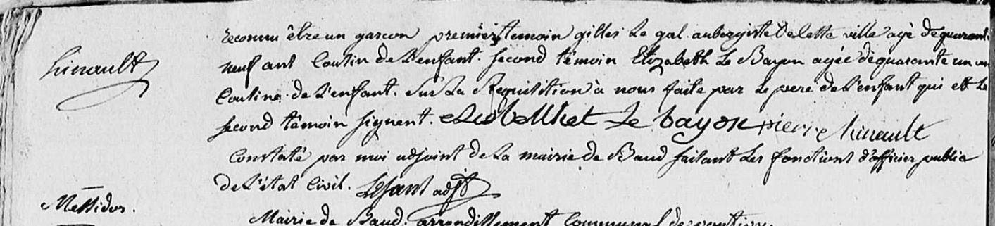 | 1. HINAULT Marie Naissance : Date : 07/04/1798 Lieu : Baud (56), Bourg Décès : Date : 04/07/1798 Lieu : Baud (56), Bourg à l'âge de 3 mois. |