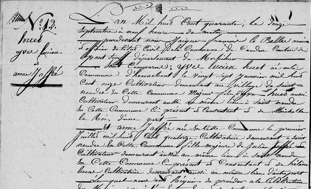 | Mariage HUET Yves Lucien JAFFRE Anne - 1840 - Caudan - 1 |