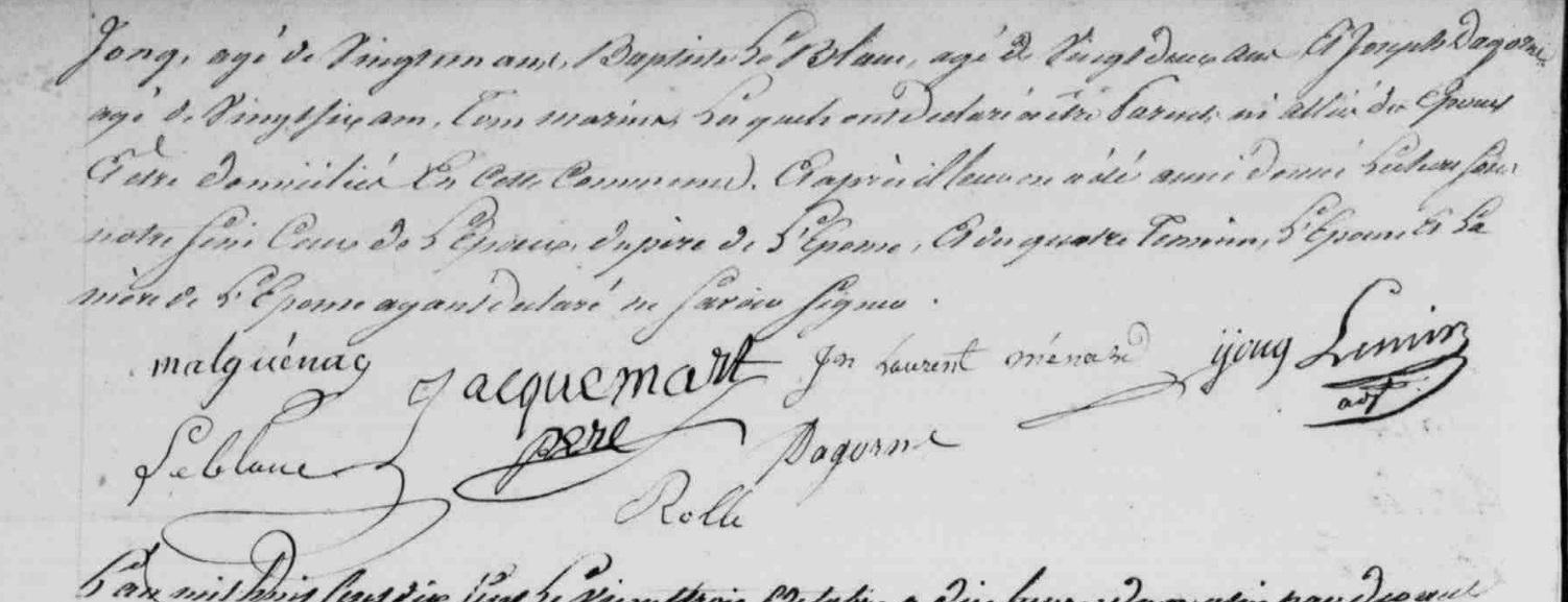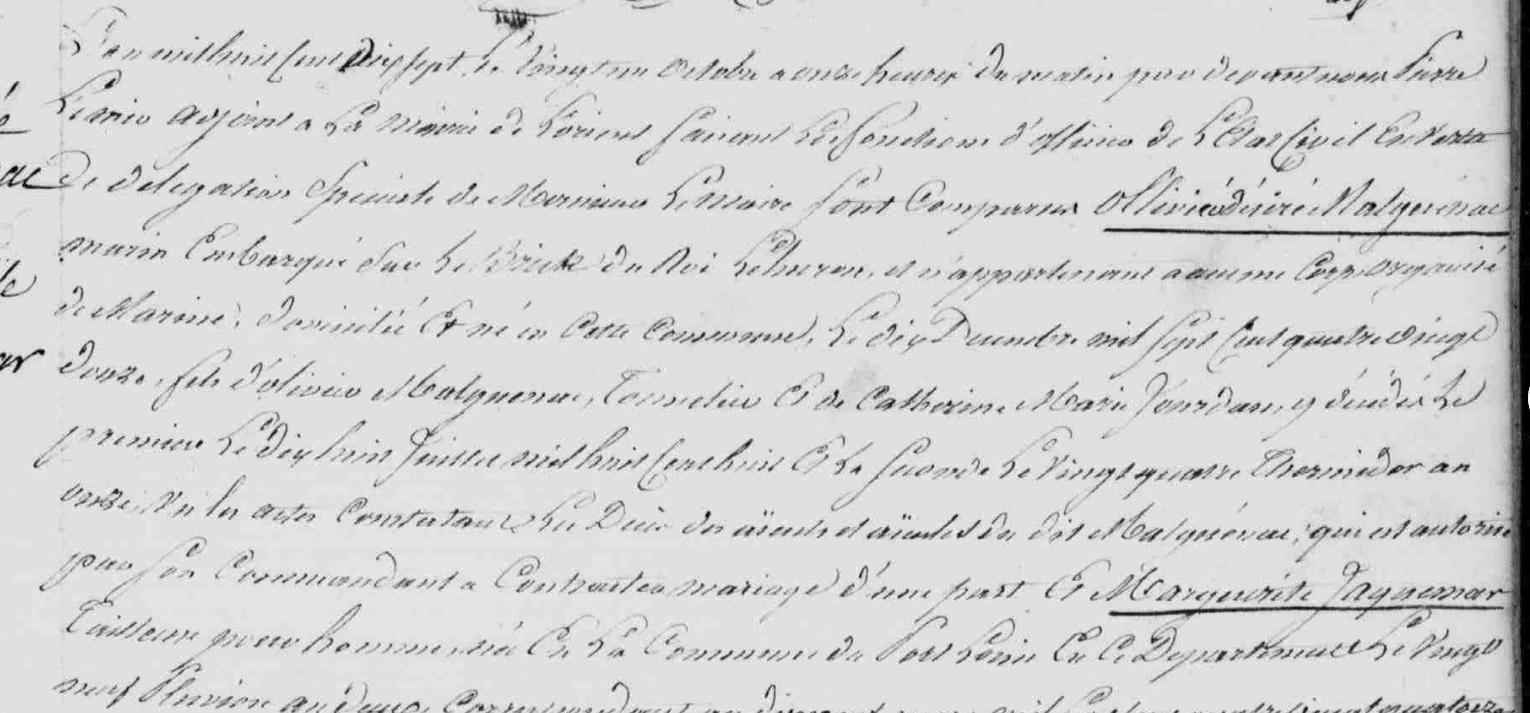 | 1. JACQUEMAR Marguerite Naissance : Date : 17/02/1794 Lieu : Port-Louis (56) Union : Date : 21/10/1817 Lieu : Lorient (56) avec MALGUENAC Olivier Désiré. Décès : Date : 08/11/1865 à moins de 71 ans. |