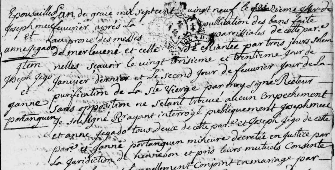 | Mariage JEGO Joseph PORTANGUEN Janne - 1729 - Merlevenez - 1 |