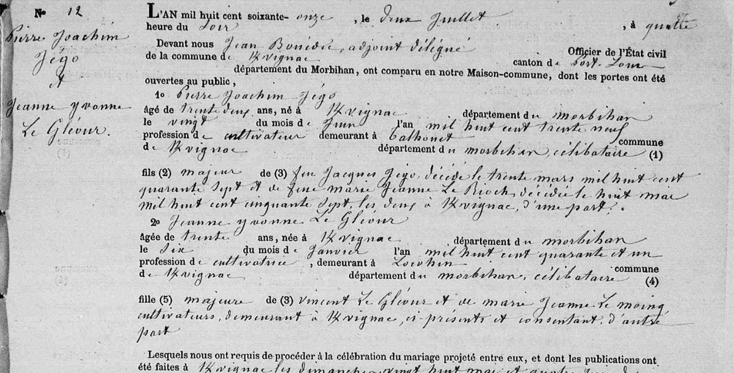 Mariage JEGO Pierre Joachim GLEOUR (LE) Jeanne Yvonne - 1871 - Kervignac - 1 |