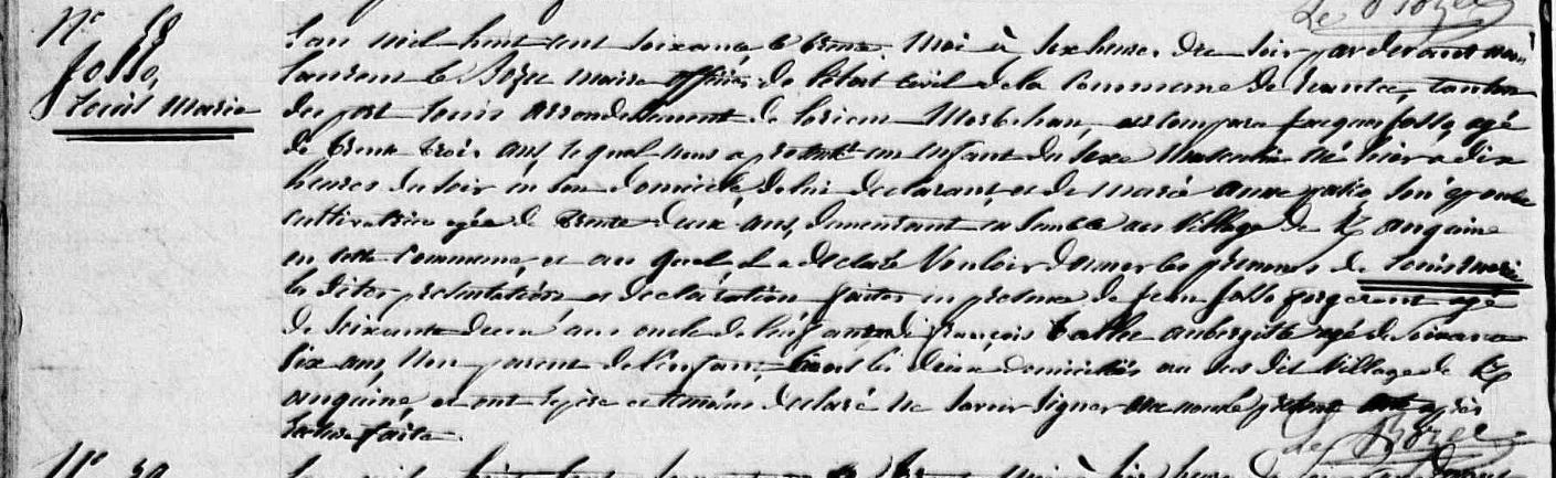 | - PASCO Louis, Sosa 110 (Naissance : 1790 Décès : 1866) - FRAPPER (LE) Anne, Sosa 111 (Naissance : 1787 Décès : 1860) |