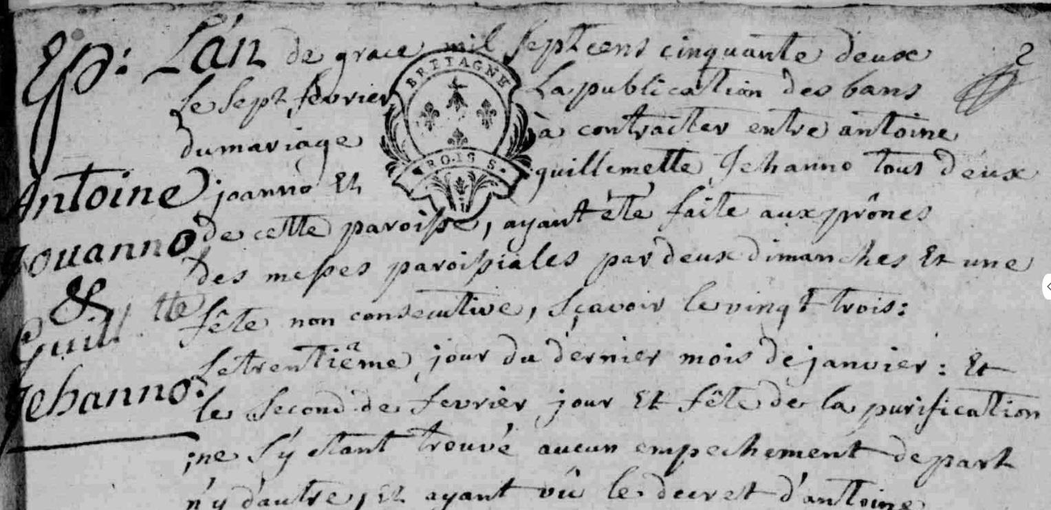Mariage JOUANNO Antoine JEHANNO Guillemette - 1752 - Plouhinec - 2 |