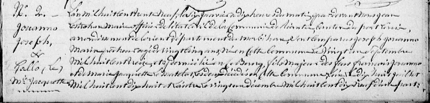 | Il est né à Riantec (56) 21/09/1813. Signature : Non. Père : JOUANNO François Décès : Date : 18/07/1818 Lieu : Riantec (56) Mère : MATELOT (LE) Marie Jacquette Décès : Date : 21/12/1819 Lieu : Riantec (56) |