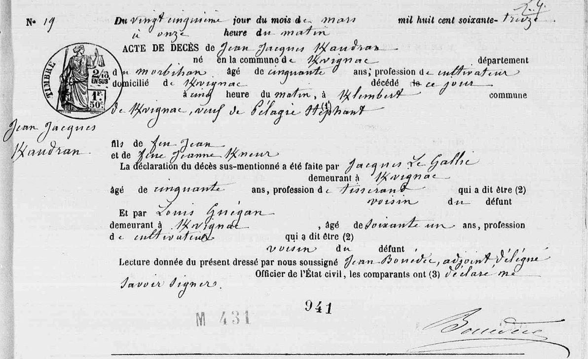 | Décès KERAUDRAN Jean Jacques - 1873 - Kervignac |