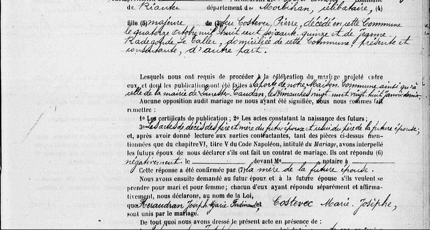 | 1. KERAUDRAN Joseph Marie Ferdinand Naissance : Date : 01/03/1869 Lieu : Kervignac (56), Kerlambert Union : Date : 11/02/1900 Lieu : Riantec (56) avec COSTEVEC (LE) Marie Josephe. |