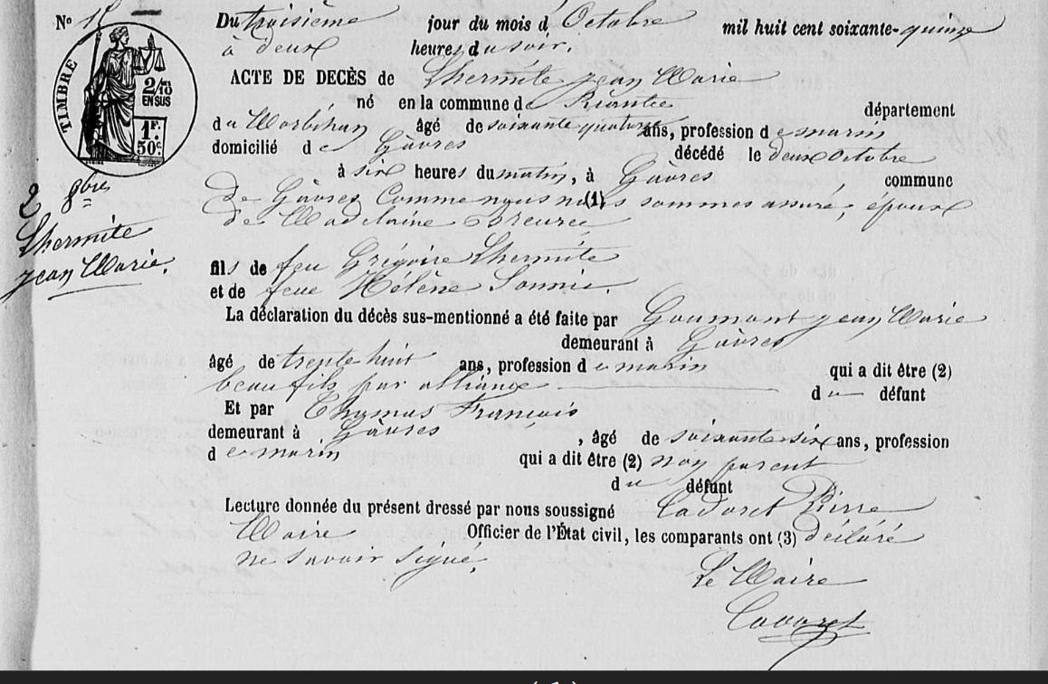 | Décès L'HERMITE Jean Marie - 1875 - Gâvres |