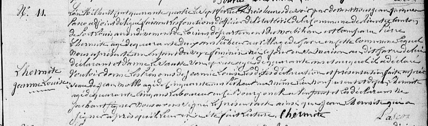 | Il naît 30/07/1809 à Riantec (56). Signature : Y. Père : L'HERMITE Grégoire, Sosa 140, Marin pêcheur Naissance : Date : 20/03/1770 Lieu : Belz (56) Décès : Date : 29/05/1835 Lieu : Riantec (56) à l'âge de 65 ans. Mère : SAUX (LE) Anne Naissance : Date : 28/03/1777 Lieu : Port-Louis (56) Décès : Date : 17/06/1816 Lieu : Riantec (56) à l'âge de 39 ans. A sa naissance, ses père et mère étaient âgés de 39 ans et 32 ans. |