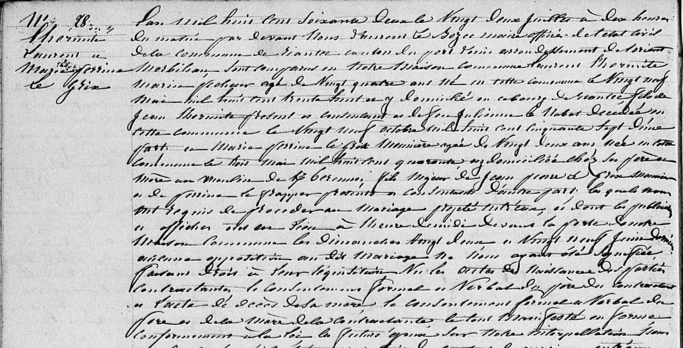 | Il est né 30/12/1805 à Riantec (56). Père : L'HERMITE Grégoire, Sosa 140, Marin pêcheur Naissance : Date : 20/03/1770 Lieu : Belz (56) Décès : Date : 29/05/1835 Lieu : Riantec (56) à l'âge de 65 ans. Mère : SONNIC Hélène, Sosa 141 Naissance : 1 Date : 25/02/1773 Lieu : Port-Louis (56) Décès : Date : 12/08/1807 Lieu : Riantec (56) à l'âge de 34 ans. A sa naissance, ses père et mère étaient âgés de 35 ans et 32 ans. |